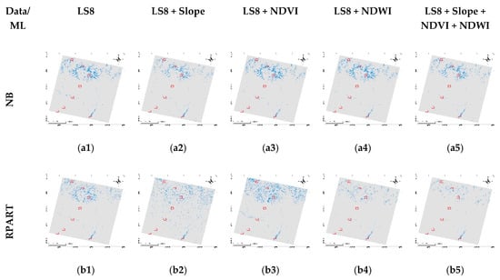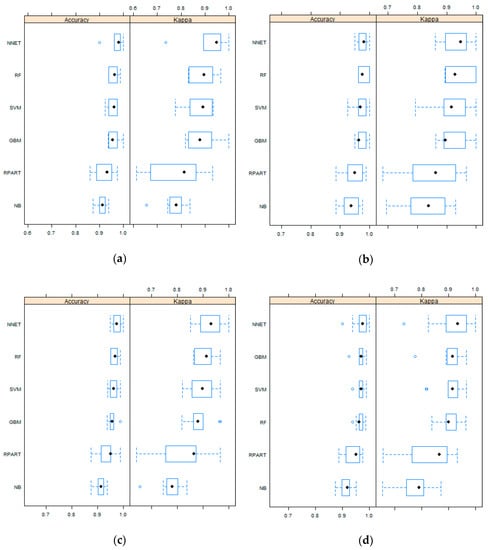 Figure 3 shows the boxplot of the OA and Kappa for different models based on the cross-validated data for five different multiband data. At first glance, it can be seen that, other than RPART and ND, four algorithms showed quite high OA and Kappa in the cross-validation. In the case with only LS8 multiband data, NNET and RF were able to achieve maximum OA and Kappa. After adding the slope, NNET and RF produced the model with maximum OA and Kappa. However, adding NDVI and NDWI with the LS8 bands, only NNET achieved improved OA and Kappa. Moreover, it can be clearly seen that the OAs achieved, with all the machine learning algorithms, narrow ranges with the addition of NDWI, followed by NDVI and the slope. The mean of OA and Kappa shifted towards higher values after adding only the slope and all three secondary bands for all algorithms, except RPART.