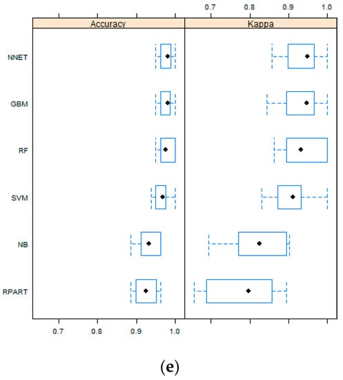 - All the applied machine learning algorithms showed OA above 90% but in case of Kappa except NB and RPART, it was above 90%.