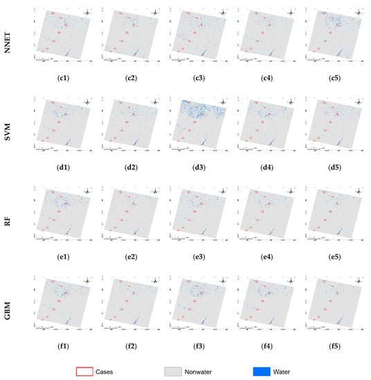 Results of surface water extraction using different machine learning methods (a–f) for provided multiband data (1–5).