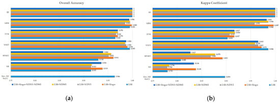 The boxplot of overall accuracy (OA) and the Kappa coefficient (Kappa) using different machine learning algorithms for provided multiband data: (a) LS8; (b) LS8 + Slope; (c) LS8 + NDVI; (d) LS8 + NDWI; and (e) LS8 + Slope + NDVI + NDWI.