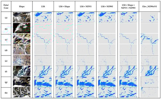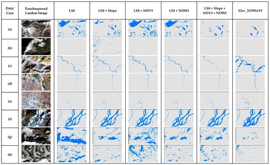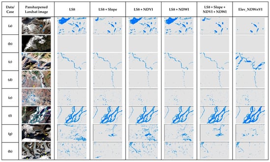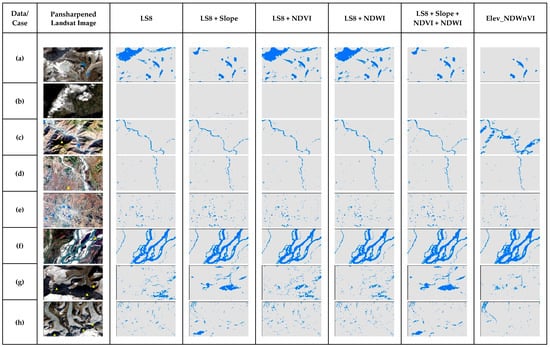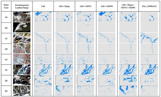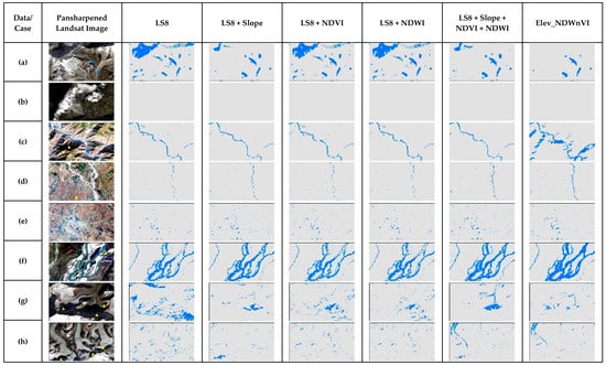 In Figure 8, NNET showed gradual improvement in identifying water bodies with the addition of secondary bands. NDWI enhanced the shadows as water compared to NDWI and all three together. For case b, the addition of NDVI misclassified few cloud shadows while others did not. For case c, all the dataset were able to solve the shadow issue from the previous shadow in the hills, except the NDVI. For the plain area in case d with the narrow river, NNET results were good in all the dataset with even enhanced small water bodies. In case e for urban small water bodies, LS8 predicted water and some shadows but with the addition of secondary bands, the pure pixels were enhanced. With the addition of all three bands, it refined the water bodies very well. For a large river in case f, the results are similar to each other and with the previous study [13]. For cases g and h, the results are different for every dataset. The slope misclassified the melting ice, NDVI misclassified the shadows and combined, showed both misclassified. LS8 only and the addition of NDWI were somewhat better compared to others. With the SVM in Figure 9, the SVM showed similar results to NNET for most cases. However, SVM misclassified the darkest shadows as water in the whole scene. It is clearly seen in case a, b, g and h, especially with the addition of the slope. In case a, with LS8 and addition of NDVI and NDWI, even light shadows were misclassified.