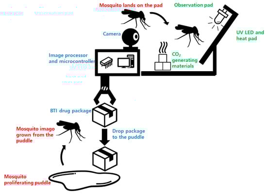 The proposed system is equipped with a clean, white mosquito observation pad that lures adult mosquitoes. An attached camera records images of the mosquitoes on the pad, attracted by the lures. If the mosquito larvae proliferate at the installed point (a constant or increasing number of mosquitoes is observed), the attached robot activates and drops a Bti larvicide package into the water to exterminate the growing mosquito larvae. Therefore, our proposed system is a novel approach to controlling mosquitoes, which not only uses deep learning-based image classification, but also uses own hardware equipped with a luring pad and Bti dropper. In addition, the whole control system is placed in an indoor experimental site and verifies that it can exterminate the mosquito larvae.