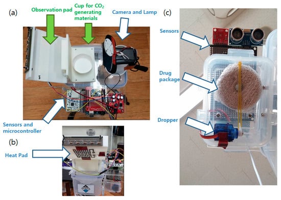 (a) The mosquito control system developed. (b) Heat pad and Ultra Violet Light-Emitting Diode (UV LED) attached to the mosquito observation pad. (c) Close-up view of the automatic Bti larvicide dispenser.