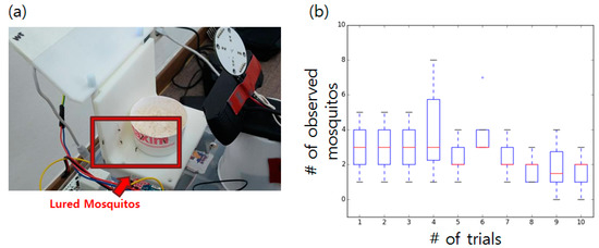 (a) Mosquitoes lured by the sensor nodes. (b) Boxplot showing the number of mosquitoes observed in the recorded video. Ten random screenshots from 10 videos (trials) were used.