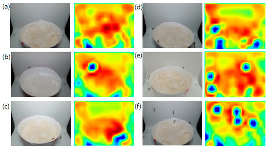 Input images (left) for the FCN and generated score maps (right) showing the probability of pixel matches to the presence of a mosquito. Each label indicates the number of mosquitoes in the image. (a) label 0, (b) label 1, (c) label 2, (d) label 3, (e) label 4, (f) label 5 (this label includes > 5 images as well).