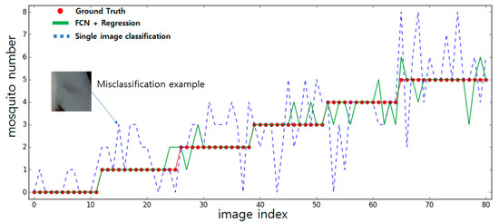 A total of 80 test images were processed and compared by the two networks. The label is limited to 5 as most images have less than 5 mosquitoes. A few images containing more than 5 mosquitoes were also referred to with a label of 5. If the network output exceeded 5 while processing the label 5 image, it was considered as a correct answer. The FCN and neural network-based regression result demonstrated an accuracy of 84%. Meanwhile, the single image classifier demonstrated an accuracy of only 52%. As shown in Figure 6, the blue line indicating the inference results from the classifier network has more divergence from the ground truth (the red dotted line) compared to the results from the regression network (the green line). As previously mentioned, though the trained classifier shows good classification results when classifying a single image patch, giving perfect answers for every image patch is a difficult task. Root mean square errors (RMSEs) of 1.37 (blue) and 0.42 (green) were obtained, showing that the regression network with the FCN score map input has much better performance in number estimation tasks. The proposed FCN and neural network-based regression demonstrated an error of ±1 most of the time, while the classification network had errors within a much higher range.