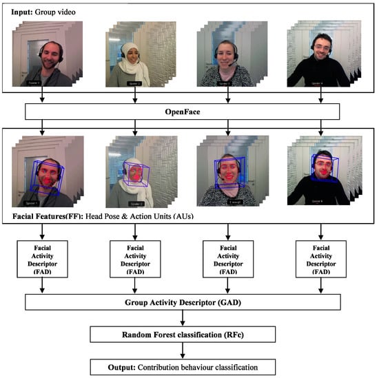 The pipeline of automated facial expression analysis from FFC videos. Each input group video consists of 4 participants communicating for three minutes (in total we have 127 different groups). Each face is first analysed using OpenFace. OpenFace detects the face, facial landmarks, head pose, and extracts facial action units (AUs). AUs and head pose form the facial features for each participant. From these, also for each participant, we calculate facial activity descriptors (FADs). All FADs from all 4 participants are then combined to form the group activity descriptor (GAD). Finally, random forest (RFc) is used to classify the facial contribution behaviour (predicting whether the group will contribute fully or not).