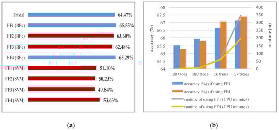 The accuracy of RFc and SVM: (a) The accuracy of RFc (30 trees), SVM, and informed guess (trivial) using leave-one-session-out crossvalidation; (b) The accuracy and runtime of RFc using FF1 and FF4 with varying number of trees.