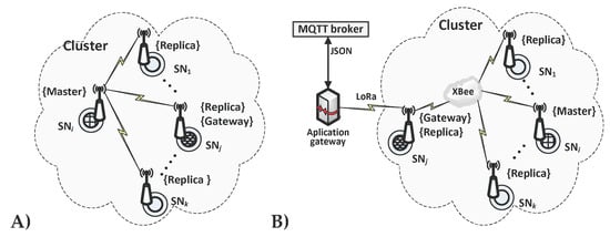 - Security domain. The domain of security is created by all sensor nodes registered in the domain. At a given moment, there is exactly one sensor node in the security domain that acts as a Master (M node). Such a node is the authority of security in the domain. Its resources store the description of the domain and the descriptions of all sensor nodes forming the domain and the necessary data to authenticate other nodes in the domain.The other nodes in their resources store a copy of the secure domain description obtained from the M node and act as a Replica (R node). In case of damage to the node acting as a Master, the procedure of selecting a new M node from correctly functioning R nodes is initiated.To secure transmission in the security domain between a given sensor node and the M node, a symmetric key (NSK—Node Secure Key) is used, which is known only for these two nodes. For this reason, the network creates star topologies in the security domain, regardless of the transmission medium used (Figure 2A)