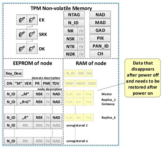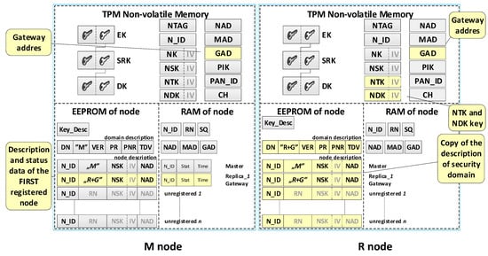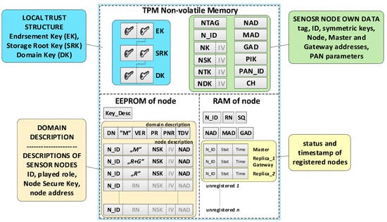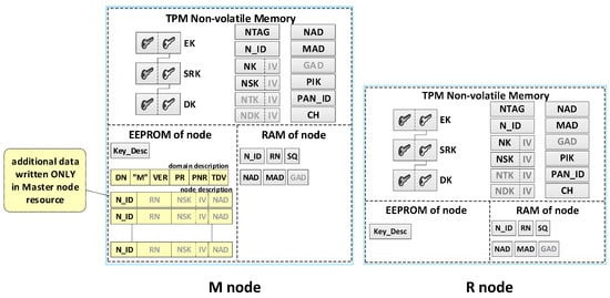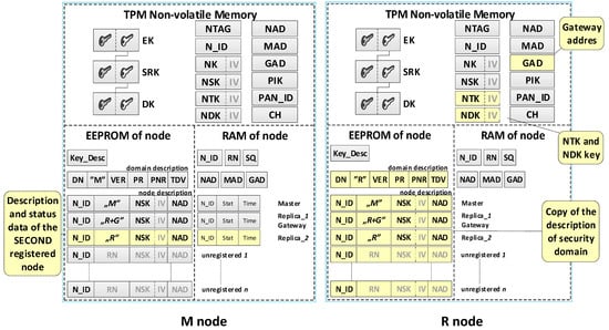 Each sensor node should be able to perform all tasks provided for nodes in the domain, and in particular, it should perform the role of Master, Gateway or both. Therefore, the resources and capabilities of each sensor node should be similar. The NVRAM of the TPM and the EEPROM of the Arduino microcontroller are intended for storing sensitive sensor node data. The NVRAM of the TPM is designed to store the sensor node’s own data, including the local trust structure of the sensor node, the necessary data for domain node authentication, and cryptographic keys which are utilized to protect the data stored in the EEPROM of the node and to secure the data transmitted from that node. The microcontroller EEPROM is intended to store the description of the sensor node domain and the descriptions of registered nodes in the domain. The RAM stores the status data of registered nodes in the domain. An example of data stored on the M node and R node is shown in Figure 4.
