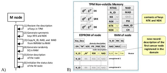 The first implementation of the secure domain of sensor nodes, using our idea, was presented in Reference []. In this solution, each sensor node uses asymmetric cryptography supported by the TPM module to protect transmission and to protect the stored data in the resources of the sensor nodes and the authentication procedures. The result of using asymmetric cryptography was a large limitation of the domain size. The storage resources of sensor nodes allowed a domain containing no more than 11 sensor nodes to be built. The foundation of our next solution, presented in Reference [], was symmetrical cryptography, which was also supported by TPM v1.2 []. In this solution, subsequent sensor nodes were registered in the domain without preliminary preparation. In the registration procedure for sensor nodes, a wireless link was used, and the procedure for registering subsequent nodes began with sending (in plain text) the public key of the M node through this link. This key was easy to intercept and then it was relatively easy to register a false sensor node in the domain. This approach made node M a very vulnerable point of the domain, and the nodes could be easily attacked before and during their registrations in the domain.