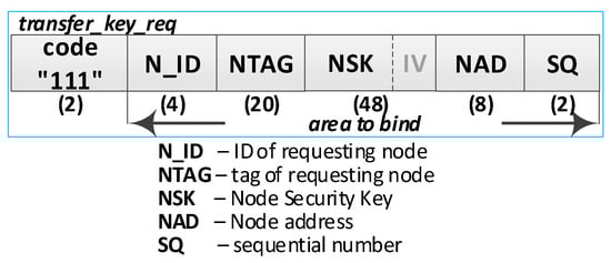 An XBee interface was used to exchange data between the domain nodes. Due to the specificity of this interface, the size of a single frame sent by this interface cannot be larger than 64 bytes. For this reason, the packages described in Table 1 must be fragmented. For example, the contents of one transfer_key_req packet containing 272 bytes will be sent in six XBee frames, of which five will have a maximum size of 64 bytes (full frame), and the last will be 48 bytes. In each full frame, 16 bytes of the XBee header and 48 bytes of the transfer_key_req packet will be sent, and in the previous frame, the payload will cover the remaining 32 bytes of this packet. Packet fragmentation increases the required volume of data to be transmitted over the link—the numbers of XBee frames and bytes to be transmitted in these frames are given in the last two columns of Table 1.