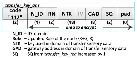 The local trust structure is based on the hierarchy of asymmetric keys (e.g., Algorithm Rivest-Shamir-Adleman (RSA) 2048). At the top of the hierarchy is the Endorsement Key (EK), which, for a given module, can be generated only once. It is not possible to modify or reset this key. It is also not possible to read the private content of this key. The next keys in the hierarchy are the Storage Root Key (SRK) and the Domain Key (DK). The SRK key is generated during the take over ownership procedure of the TPM. During this procedure, a secret (a string of characters) is determined, which later will be necessary to perform authorized actions of the sensor node in the security domain. The DK key is common to all nodes of the secure domain and is used for only the first exchange of symmetric keys between domain nodes. The DK is distributed between the domain nodes using a specially prepared secure procedure. The DK distribution procedure between domain nodes is described in detail in [,]. The private part of this key is never available in plain text form outside of the TPM module, and the public part of this key, although available in plain text outside the TPM module, is never transmitted between the nodes in an open form. The DK can be treated as the identifier of the secure domain of the sensor nodes, and the EK can be treated as the identifier of the sensor node in the domain.