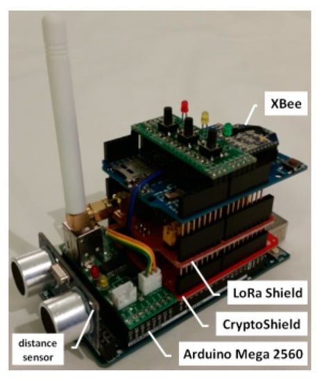 The presented concept of a secure domain for sensor nodes has been experimentally tested. A domain demonstrator covering several sensor nodes was prepared for the needs of the research. Each of these sensor nodes (Figure 22) consisted of the following components: an Arduino Mega 2560 R3 microcontroller, a TPM (Used module meets the requirements described in Security Policy for Atmel TPM [] as well as the strength requirements of FIPS 140-2, Level 2 []) v.1.2 installed on Cryptotronix CryptoShield, Dragino LoRa Shield 868 MHz v1.3, and a wireless communication module, XBee. The role of the measuring sensor, which was the source of sensor data in the domain, was performed by the ultrasonic distance sensor.