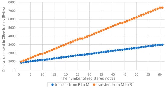 The data volume to be transmitted for a domain with several dozen nodes is quite large and for N = 60, it is 10,356 bytes. The time needed to register the tenth node in the sensor domain was experimentally tested. This procedure required 1168 bytes to be sent towards R → M and 1892 bytes towards M → R. The registration time for this node was a few seconds—the XBee interface was operating at 57,600 bps.