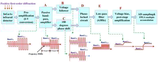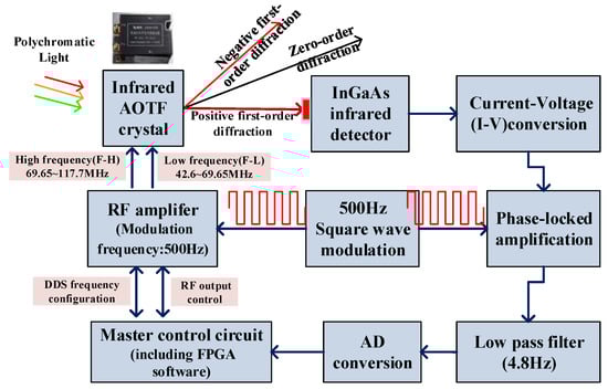 For weak infrared signal processing technology with phase-locked amplification, moving parts (such as the modulating reticle and chopper) are generally used for modulation between the signal light and background, such as the spatial target infrared spectroscopy system []. In the VNIS, a phase-locked amplification model without moving parts is designed according to the characteristics of AOTF, as shown in Figure 6. By controlling the output RF signal amplified by the power amplifier, the periodic modulation of the output positive first-order diffraction light at the AOTF outlet can be controlled. The modulation frequency is designed to be 500 Hz. This 500 Hz frequency is generated by the FPGA chip, not by the moving parts (such as motors or galvanometers), it has a great advantage in reliability for space applications.