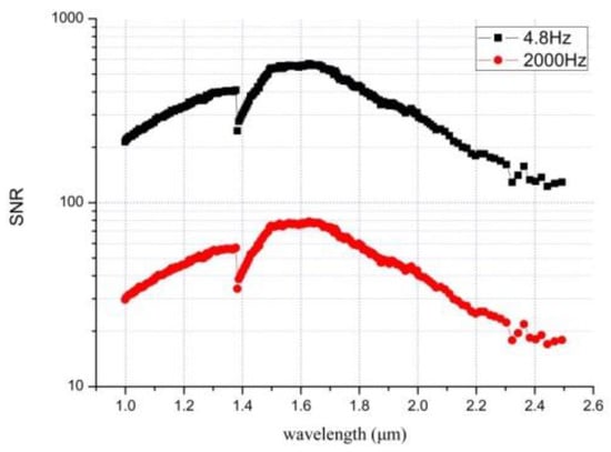 As shown in Figure 7, there exists a step at 1380 nm. The reason is that the SWIR AOTF crystal has two driving frequency range (F-H and F-L), and the 1380 nm is exactly the frequency switching point of the SWIR AOTF crystal. It can be seen from the Figure 7 that the SNR is about 600 at 1.7 μm.