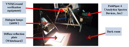 The experimental test was carried out in a dark room, using a halogen lamps to illuminate the diffuse reflection plate (reflectance >90%), and then at the same angle, using both VNIS (ground verification equipment) and a commercial spectrometer ((FieldSpec 4, Analytica Spectra Devices), Inc.) measure the spectral radiance forced by the diffuse reflection plate [].