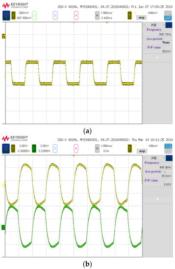 The positive first-order diffraction light after passing through the AOTF crystal is received by the InGaAs detector. After current-voltage conversion by a preamplifier, it is sent to the subsequent stage for signal conditioning. As shown in Figure 6, for two consecutive wavelength signals (band λi and band λi+1), after 500 Hz electronic modulation, what emerges is a periodic (500 Hz) infrared analog signal similar to a square wave after passing through the preamplifier. After passive band-pass and pre-amplification, the square wave appears to be an approximate sinusoidal signal, and the peak of the waveform reflects the intensity of the infrared monochromatic light of the wavelength. Then, it converts the signal into two signals of the same frequency and the same amplitude but with an heir phase differing by 180 degrees.