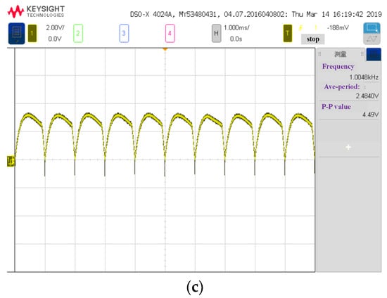 The analog signals of VNIS at 1.7 μm captured by oscilloscope (corresponding to A, B, C and D in Figure 6). (a) The analog signal after current to voltage(I-V) conversion captured by oscilloscope (point A in Figure 6); (b) The analog signal before phase-locked circuit captured by oscilloscope (the yellow is for point B in Figure 6, and the green is for point C in Figure 6); (c) The analog signal after the phase-locked circuit captured by oscilloscope (point D in Figure 6).