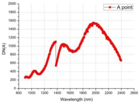 On 4 January 2019, the instrument obtained the infrared spectrum data of the first scene on the far side of the moon. Figure 11 shows the scene of the first infrared spectrum on the far side of the moon. Through absolute lab and in-flight radiometric calibration, we can get the relationship between DN values and spectral radiance at the entrance pupil, which is consistent with B(λ) in Figure 11. The spectral radiance B(λ) divided by the solar irradiance E(λ), multiplied by π, and further divided by the cosine of the incident angle θ can obtain the reflectance factor ρ(λ) []. The DN values of the original infrared spectrum data of A Point and its full-spectrum SNR are show in Figure 12 and Figure 13, and Figure 14 gives the infrared spectral reflectance curve (900–2400 nm) at A point. In this test, the solar elevation angle is about 15 degrees.