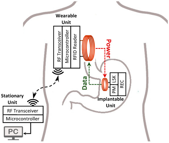 The detailed block diagram of the system consisting of the implantable, wearable and stationary units for near-field communication and wireless power transfer is presented.