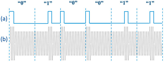 in which, is the mutual inductance between the primary and secondary coils. The reflected impedance of the secondary side in Equation (5) is directly proportional to the load resistance connected to the secondary coil. In this regard, load-shift keying (LSK) modulation can be implemented by switching on and off a load (ground connection) at the IU’s coil through an NMOS transistor switch, which is reflected as the changes in the impedance of the WU’s coil and consequently, modifies the voltage level of the RF power signal. Since the primary coil is matched to 50 Ω, when the switch is open, the reflected impedance detunes the matching network and slightly decreases the voltage amplitude at the WU’s coil. Otherwise, for sending 0.5 µs high-pulses of the DPP encoded data, the switch is closed, zero resistance is reflected from the secondary coil and so, the voltage at the primary coil increases to the level corresponding to 50 Ω tuned matching network. At the WU, an envelope detector circuit detects the voltage level variations and demodulates the transmitted data, accordingly. The schematic of the data modulated over the RF carrier signal is shown in Figure 4.