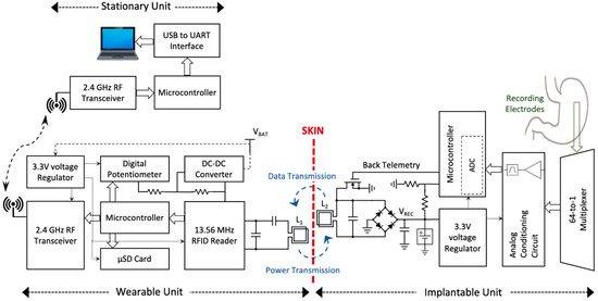 The block diagram of the near-field communication system for simultaneous wireless power transfer and telemetric acquisition of the gastric bioelectrical activity is shown.