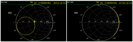 The impedances of (left) the wearable unit’s transmitter coil with the 50 Ω capacitive matching network equal to (49.5 + j0.3) Ω, (right) the impedance of the implantable unit’s receiver coil resonant LC network equal to (16.5 + j0.0041) kΩ, both measured at the RFID carrier frequency of 13.56 MHz.