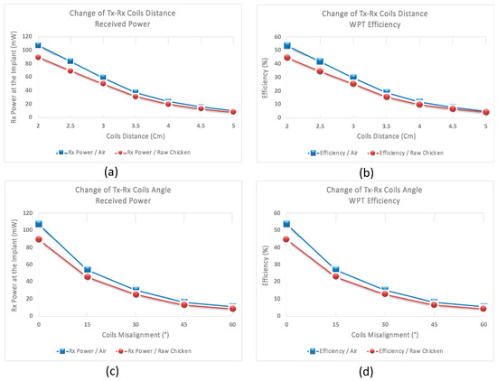 (a) and (b) show the received power and efficiency when the distance between the TX and RX coils is changed from 2 cm to 5 cm for air and raw chicken. (c) and (d) show the received power and efficiency when the alignment between the TX and RX coils is changed from 0° to 60° for air and raw chicken.