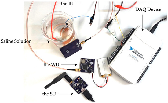 For validation of the NFC recording system, the IU was drawn in a container of saline solution. In this test, 5-min sample SWs recorded previously in-vivo by our group were used [19]. Sample signals were loaded into a digital to analog converter (DAQ device USB-6218, National Instrument) through a custom-made application and were streamed into the solution. The data were verified in two steps. First, the consistency between the DPP-encoded data at the IU and the demodulated data which were recovered at the WU were verified. Then, the data received at the SU and monitored in the GUI in real time were observed to be identical with the amplified original signals recorded at the IU. The benchtop setup for the NFC verification is shown in Figure 9.
