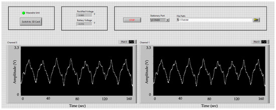 Two independent data logging modes were implemented in the system. The first mode is based on a 2.4 GHz RF link between the WU and the SU. Hence, the demodulated decoded data at the WU are transmitted to the SU connected to a computer. Through a GUI, the data can be monitored in real time and simultaneously stored in a text file for offline analysis. This method is preferred when the patient is under direct monitoring in a clinical facility. The second mode of data logging, which is wirelessly configurable through the GUI, is to store the data locally on the WU on a micro SD memory card. The data can be extracted from the memory card, anytime during or at the end of the GEA monitoring period.