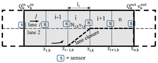 In the SCM, the road network is divided into a given number of cells, n, also called segments. Each segment has a length and number of lanes as shown in Figure 1, where . At any given time period k, a certain number of vehicles crosses the boundary between two segments i and . The number of vehicles in a given cell i within the same time period k is represented by with their average speed given by .