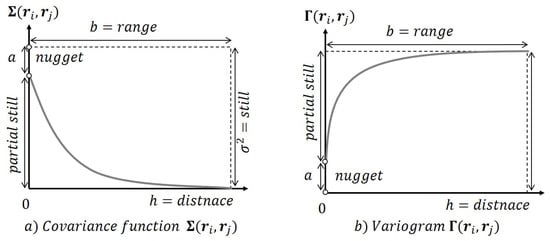 The process of covariance function modelling requires to find a covariance curve that has the best fit to the empirical data Equation (9), possibly being a subject to constraints. The covariance models to choose from include exponential, spherical, Gaussian, linear or power model [14]. In this work, the best fit for the dataset was achieved by the exponential model depicted in Figure 2a and given by