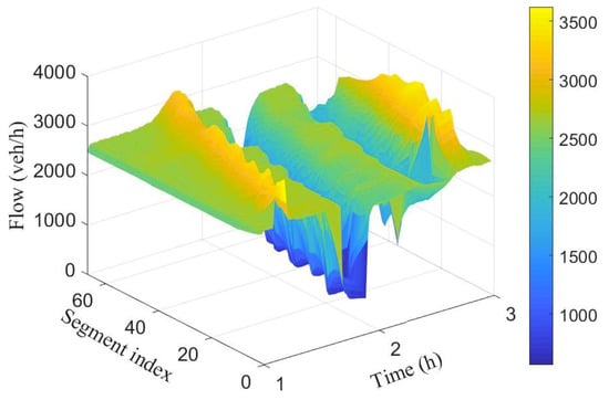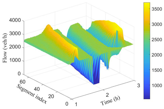 Figure 7 and Figure 8 show the spatio-temporal evolution of the traffic flow and the corresponding average speed for the 100 segment scenario.