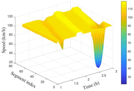 Observe that the effect was felt more close to the inflow boundary. The vehicles’ speed increases marginally as they move into the network. Between time interval [1.6 h, 1.9 h] the flow was decreased leading to increase in the average speed. Finally, the number of lanes in segments 10 to 14 were reduced from 3 to 2 between time interval [2.4 h, 2.4 h] while maintaining vehicle injection rate. This results to substantive decrease in speed as can be seen (cone-shaped) in Figure 4. As the vehicles leave the segments with closed lanes, there is increase in their speed again.