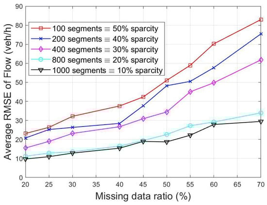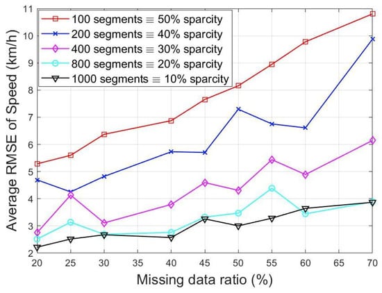 The results indicate that considering a larger number of segments would reduce the overall estimation error even when the missing data ration is high. From the foregoing results and discussion, it is recommended that the best estimation accuracy would be obtained when the entire road network is considered at once. The effects of computational overhead could further be reduced by using a distributed approach with a central control unit.