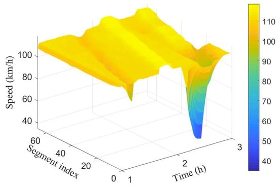 To simulate different scenarios such as congestion and free flow, (i) the number of lanes were decreased from 3 to 2, and (ii) the rate of vehicle injection into the network is varied at different time periods. Figure 3 and Figure 4 show the spatio-temporal evolution of the traffic and their corresponding average speed, respectively, for a 100 segment section. The average speed of the vehicles varies around 100 km/h when the flow was around 2000 veh/h. Between time interval [1.5 h, 1.7 h], the flow was increased slightly to cause congestion, this resulted to a decrease in the average speed as can be seen in the first spike from Figure 4.
