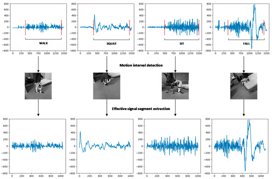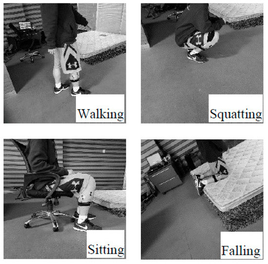 Since the final purpose of this experiment is to distinguish between falls and daily actions, four different gestures are required. The classes are: walking, squatting, sitting and falling. The walking movement is completed on a flat road with a length of 10 m and the walking time is about 12 s. Data under the state of smooth walking are selected. Figure 2 shows the different gestures.