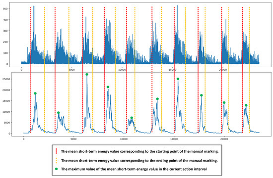 Partial data of the subjects were selected for manual segmentation of the action interval and the mean value of the ratio between the mean short-term energy corresponding to all starting points () and the maximum value of the mean short-term energy in the corresponding interval was calculated and multiplied by the maximum value of the mean short-term energy () of the rest data of the subjects, so as to obtain the static threshold of the starting point for the subject. The static threshold of the starting point () was defined as: