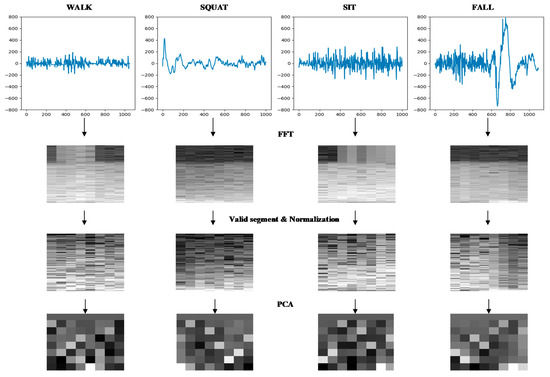 The frequency domain feature selects the spectrograms. The spectrograms contain two kinds of information, time and frequency, which reflects more information that cannot be observed in time domain features. The analysis of spectrogram analysis can improve the discriminability between different actions.