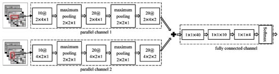 The focus of the two channels is different. Channel 1 used a 2 × 4 convolution kernel, which focused on analyzing horizontal continuous information in the spectrum, while channel 2 used a 4 × 2 convolution kernel, which focused on analyzing vertical continuous information in the spectrum. The two channels do not influence each other in the process of feature extraction. Finally, the outputs of the two channels were combined and passed to the fully connected channel.