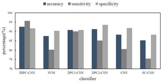 RMS and SPM were selected as features and IDPC-CNN as the classifier. The comparison test was conducted under the same experimental environment and the same data set. The CPU was Intel i5-8400 with 8GB DDR4 RAM and the GPU was NVIDIA GT710. All performance indicators were obtained through 10-fold cross-validation. The program running time of each stage and the final accuracy are shown in Table 3.