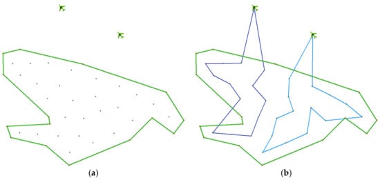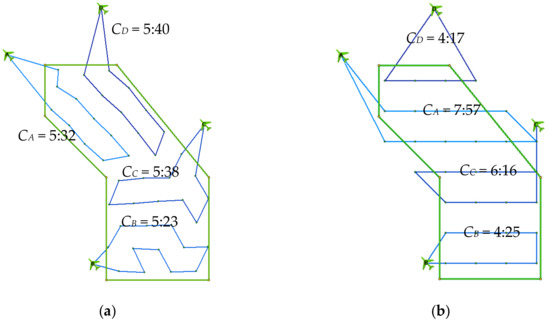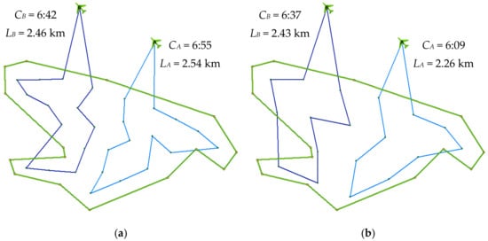 Figure 11 shows routes planned via the original (Figure 11a) and new version (Figure 11b). The model estimates that the operation would be completed, that is, at the moment when both drones had returned to their initial positions, in 6:55 min in the case of the original version (27 waypoints), and in 6:37 min in the case of the new version (18 waypoints). The length of the routes of UAV A is 2.54 km (original version) and 2.26 km (new version), and for UAV B, it is 2.46 km (original version) and 2.43 km (new version); the total distance travelled by both UAVs is 5.00 km (original version) and 4.69 km (new version), respectively.