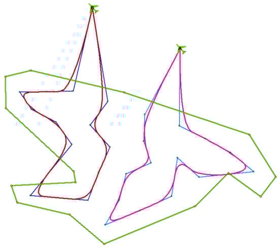 The original CAR model was improved in the work of [29], where the trajectories were smoothed in order to achieve the following: (a) shorten their length and thus hasten the reconnaissance operation, and (b) be able to use fixed-wing UASs that cannot change direction so abruptly. The result of this improvement, applied to the previous example situation, is shown in Figure 2 in red.