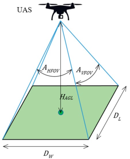 The situation is presented in Figure 3. A UAS flies at the height above ground level, which is the minimum height allowed. At this height, the camera of the UAS scans the green area (rectangle), the size of which is determined by the angular vertical and horizontal field of view (, ). The resolution and other technical parameters of the camera must be adequate to be able to scan the area at the required level of detail from the maximum allowed height of flight.