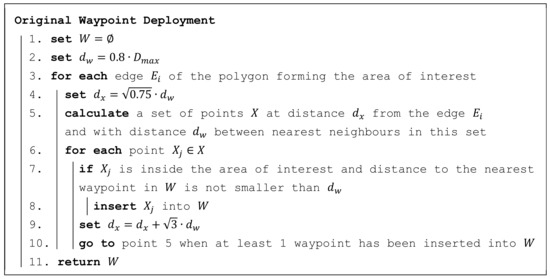 This algorithm is presented in Figure 7 using pseudocode. A solution represents a particular deployment of waypoints, that is, it is a vector of independent variables, where each pair corresponds to a position of one waypoint in a plane: .