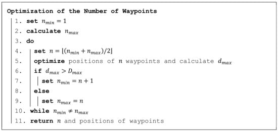 The algorithm calculating the minimum number of waypoints is shown in Figure 5. It is based on the principle of the half-interval search. Firstly, the limits and are determined; the lower limit is set to 1 and the higher limit is calculated according to Formula (4), which ensures that condition (3) is met with certainty. Then, the limits gradually approach one another until they meet, which means that the minimum possible number of waypoints is found.