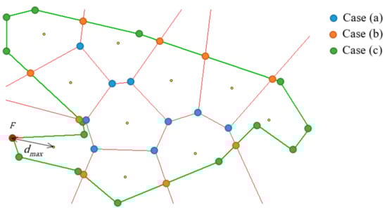 The principle is graphically shown in Figure 6 in an example with 10 waypoints. The green lines represent the polygon of the area of interest, the small yellow dots are waypoints, and the red lines border the regions of the Voronoi diagram. The blue, orange, and green circles show the points of subset ; the colours are used to distinguish between the three cases mentioned above. In this example, the farthest point from the waypoints is marked in red.