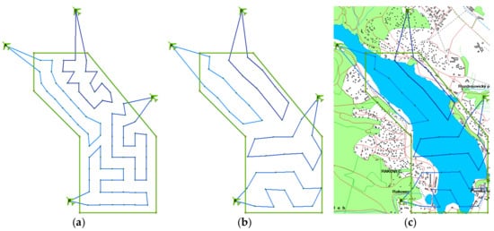 Table 4 shows the parameters of the benchmark problems, created based on typical reconnaissance situations in the real environment. The table records the basic parameters of the polygon, along with the number of points forming the area of interest and the number of UAVs in the fleet available for the reconnaissance operation. The last column of Table 4 details the maximum permitted distance given by the technical parameters of the particular UAVs and tactical requirements according to Formula (2).